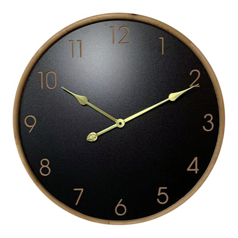 This black wall clock with a wood frame, cut-out numbers, and gold hands offers a striking, modern look that’s timeless and bold in any space.