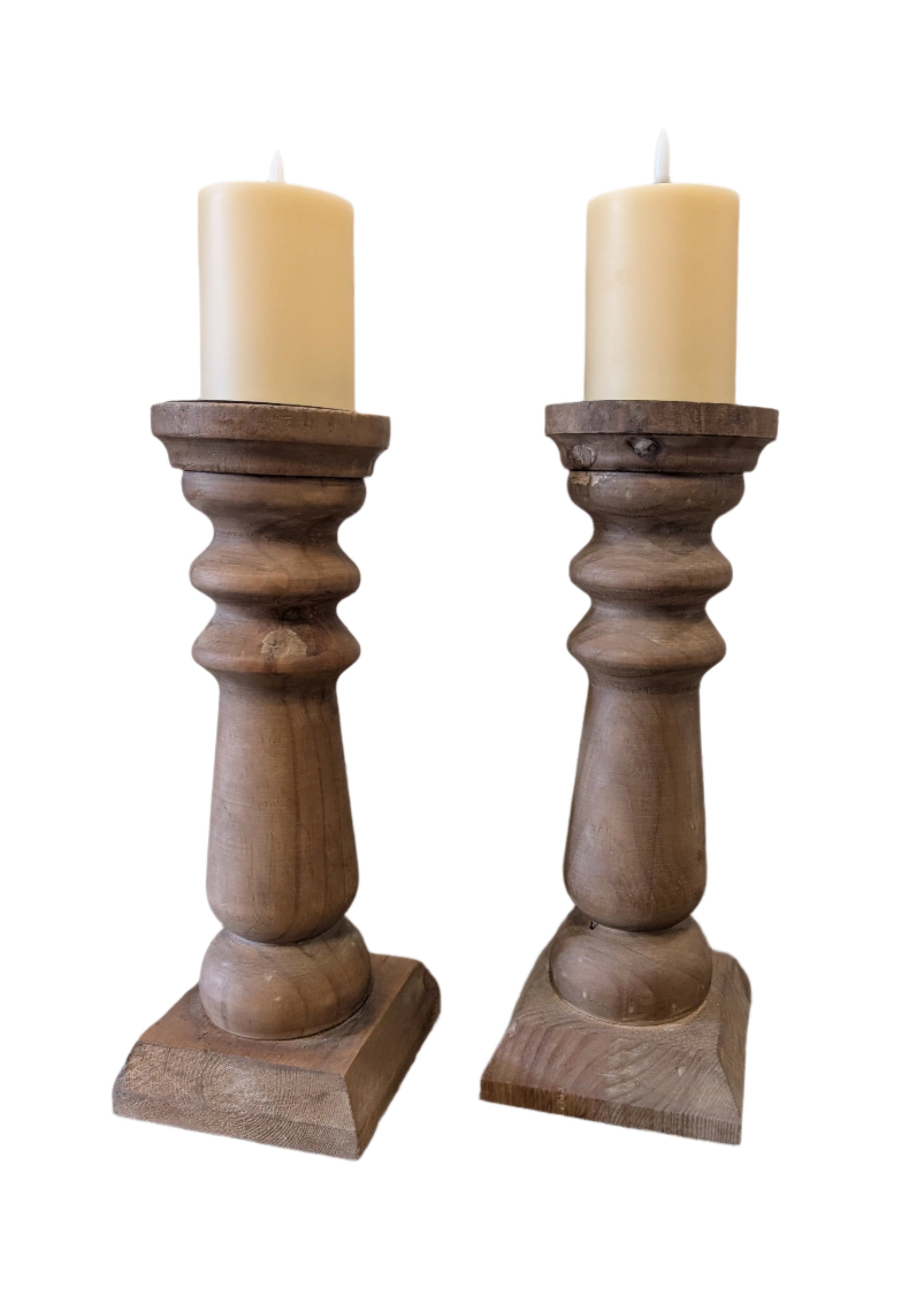 These large wooden candlesticks bring height and warmth to any space. Sold individually, each piece adds rustic charm to mantels, tables, or displays.