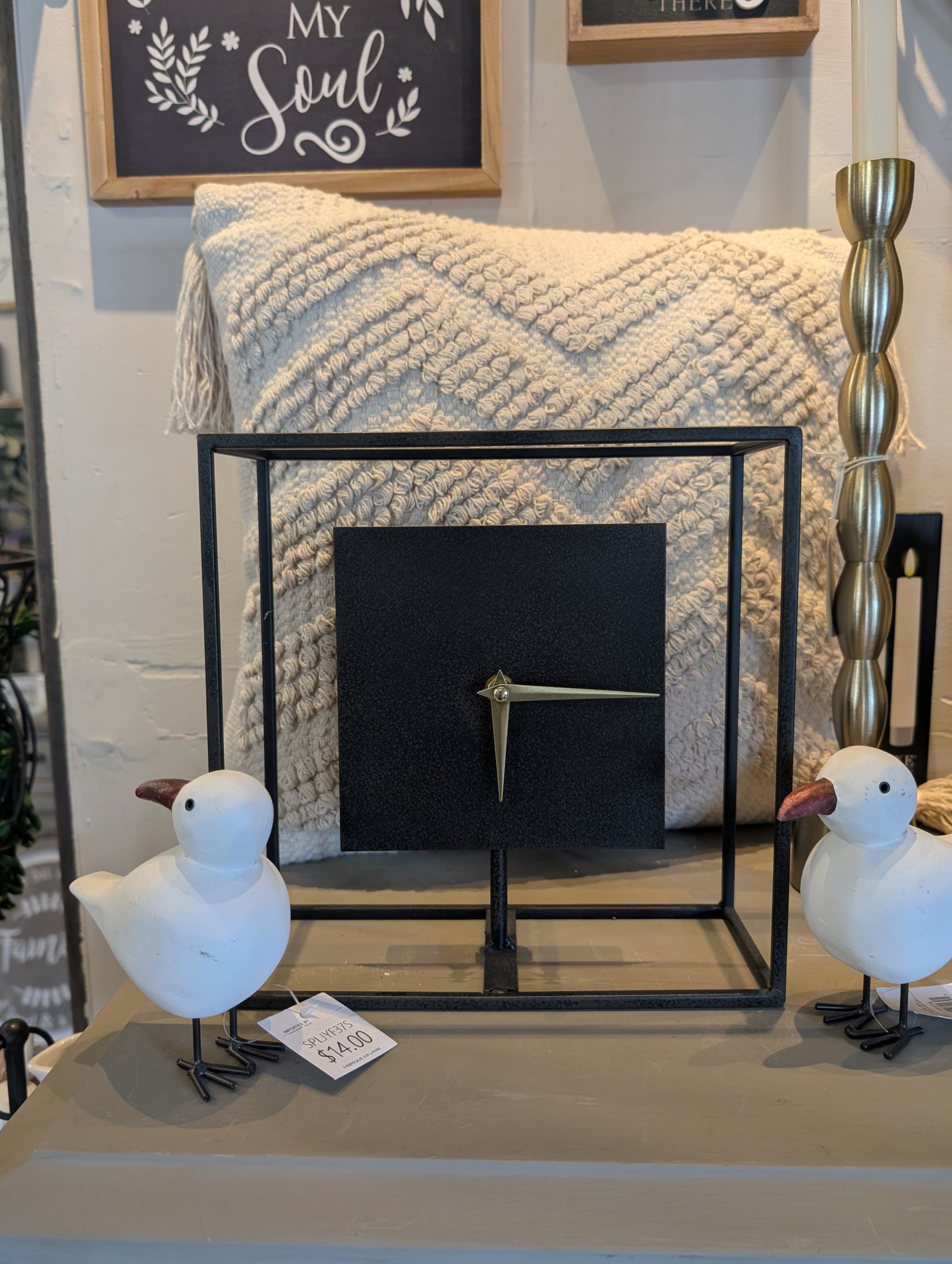 Modern meets minimal in this striking black metal clock. With a cube frame and sleek gold hands, it's a bold statement for shelves, desks, or mantels.