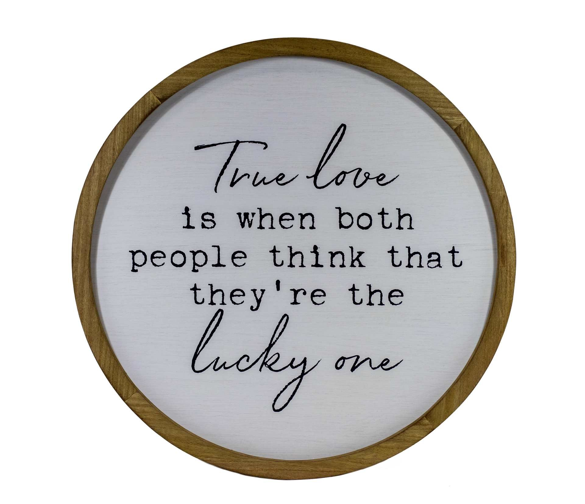 Charming round wood sign featuring the quote: "True love is when both people think that they're the lucky one." A perfect touch of romance for any space.