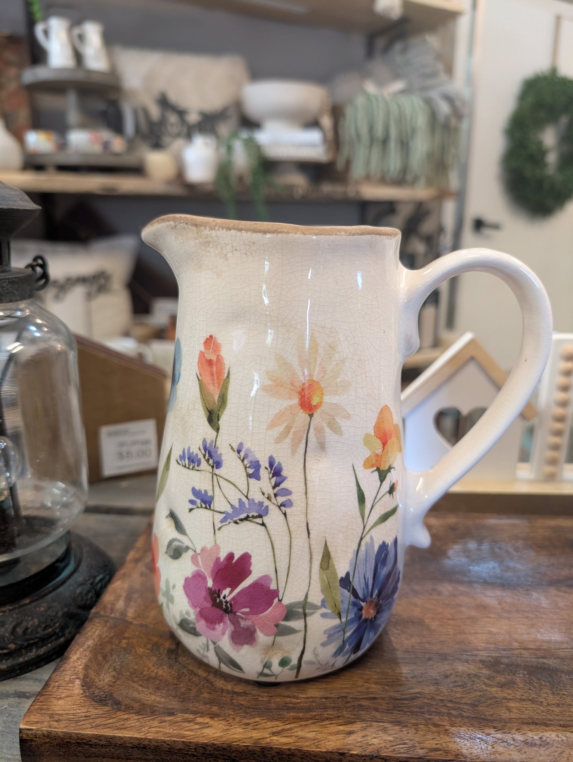 White ceramic jug with a charming wildflower design and crackle finish. Perfect as a vase or decorative accent. Matches our floral pots (sold separately).