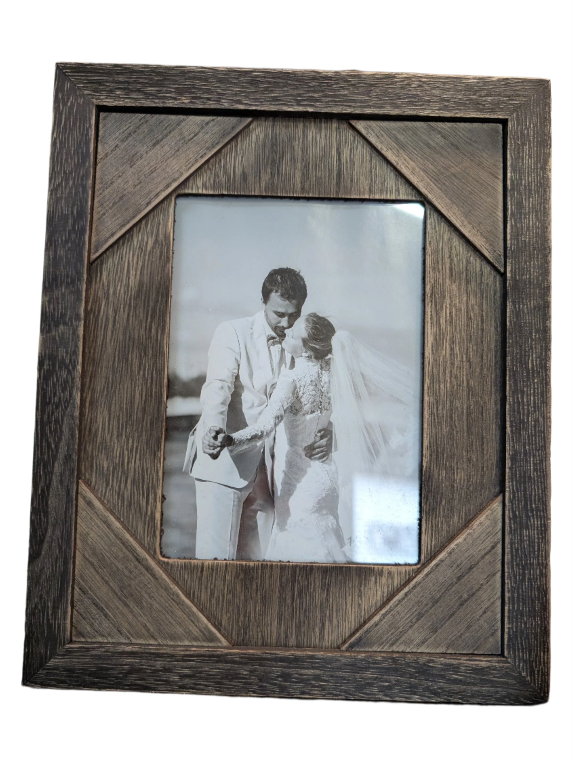 This wood frame features handcrafted insert details that add depth and natural texture, offering a timeless and earthy accent to your favorite photos or art.